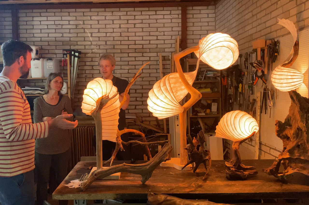 Light sculptures inspired by nature: the tree bases found in the forest are complemented by gracious cotton-feel cocoons made of paper. It makes for a warm and soothing light source.
